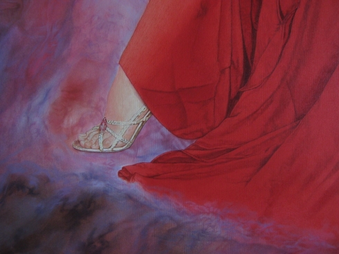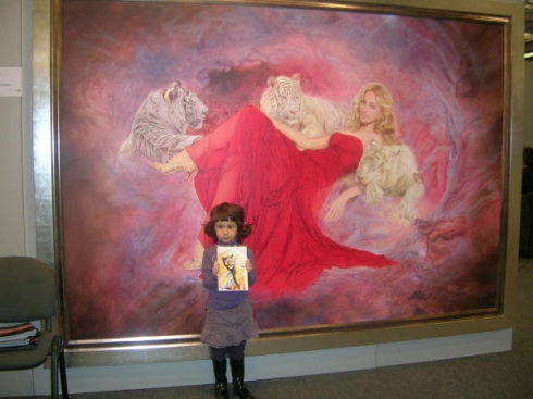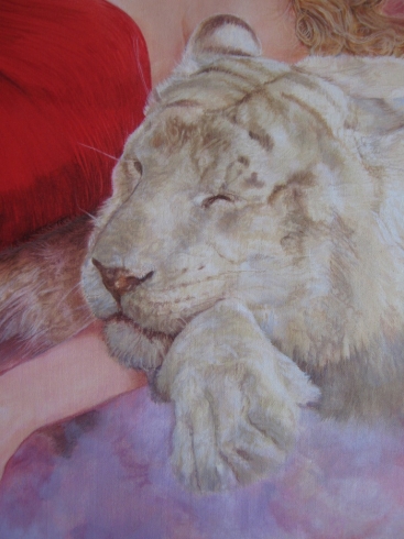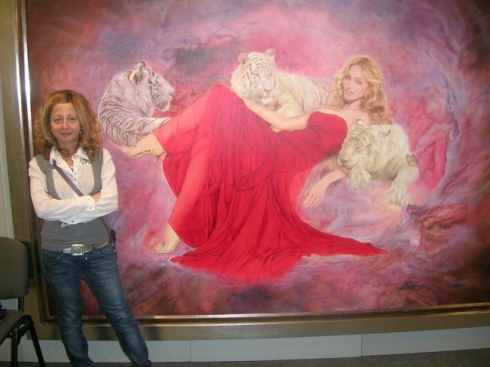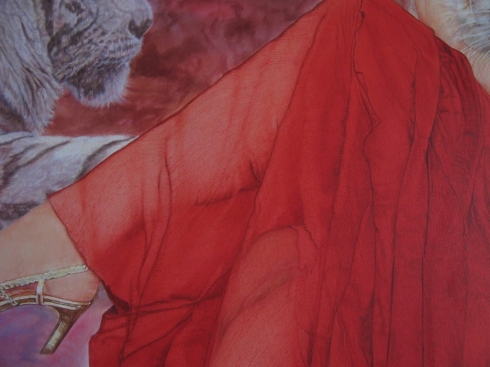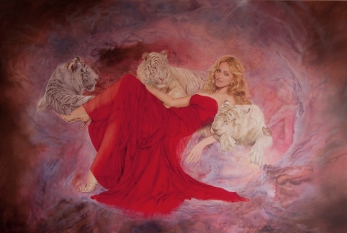 Fellow artist Erna Kaluza praises, “Virtues of the Soul… is another great painting by the very talented Portuguese artist Oscar Casares. The beautiful likeness of Madonna with the three magnificent white tigers by her side is centered on a nebulous background that seems to hold the mysteries of the universe hidden within. Madonna’s red gown elegantly drapes her slender body, the true sheerness of the material evident only at her legs. It is a vision of beauty, elegance and mystery.”